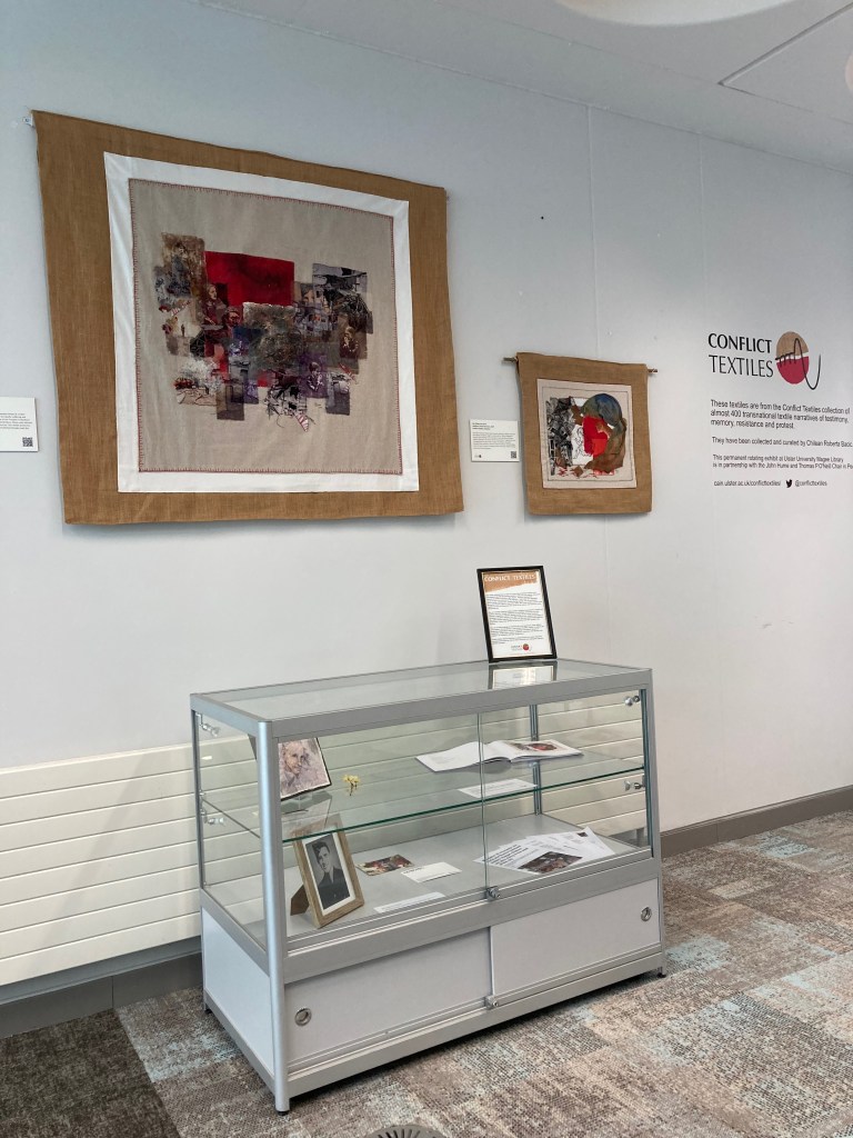 I have this exhibition on now in the library of Ulster University’s Derry-Londonderry campus. It’s part of the exhibition ‘Threads of Empowerment: Conflict Textiles’ International Journey’ in the Ulster Museum, Belfast. My work here will be on exhibition until 31 January, 2025.