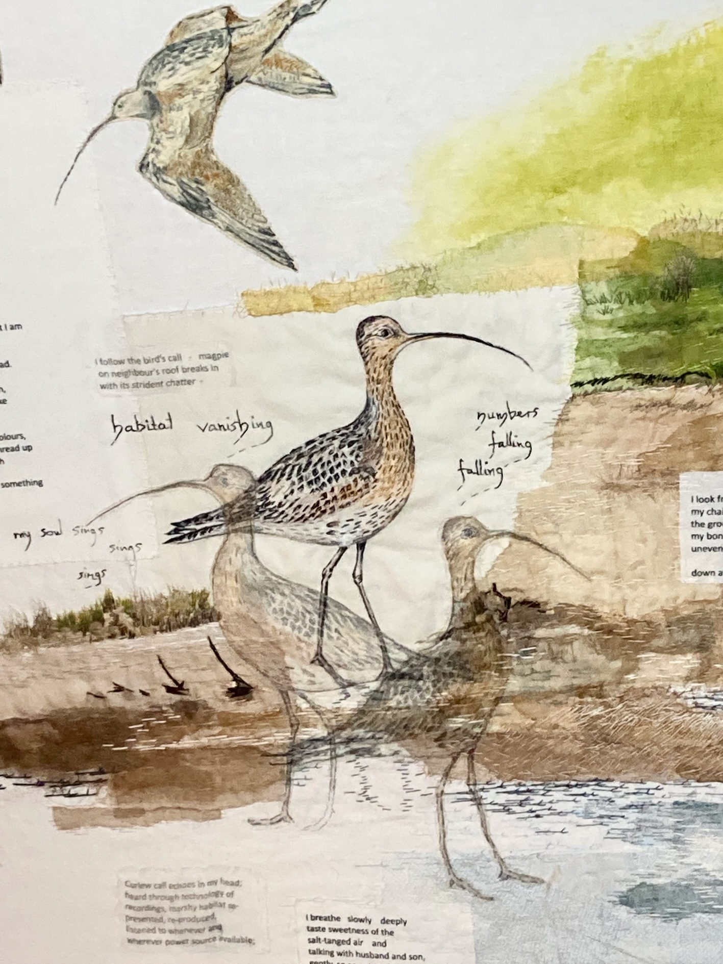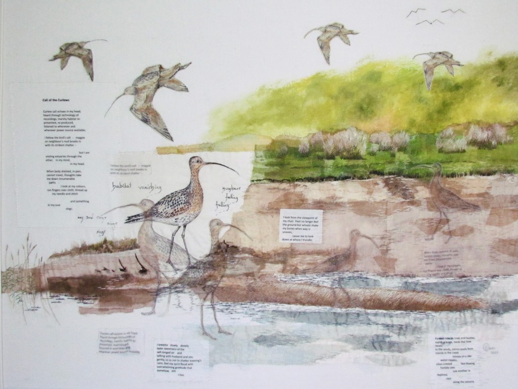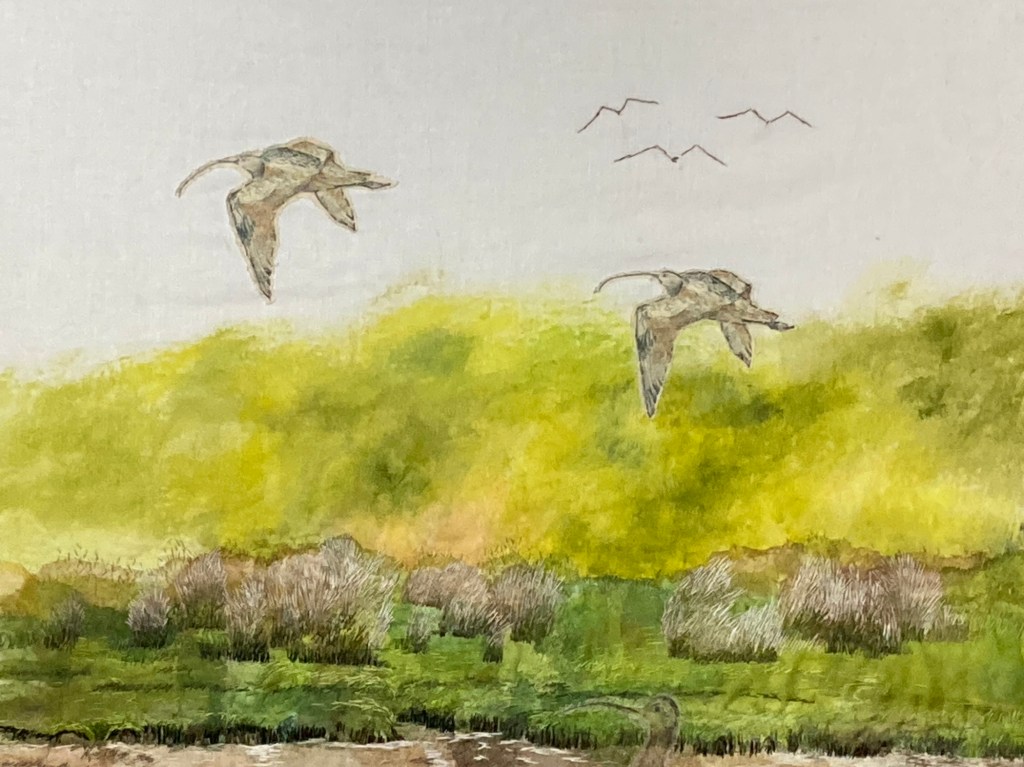 Another detail from Plight of the Curlews – Must We Lose Them? This image shows some flying birds and the grasses at the edge of the estuary that I stitched as part of the background habitat of the curlews. I based my imagery on one of the walks I made along the Mawddach Estuary near to my home in Dolgellau. Curlews have been seen at this location.