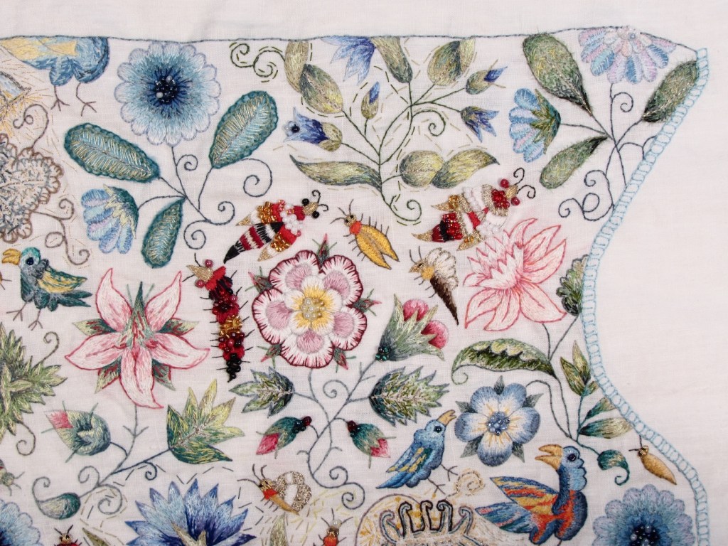 The Unstitched Coif 2023 detail showing part of the lower right hand quarter of the coif. A departure from my usual work, I stitched this when I was taking part in the project of the same name initiated by Toni Buckby as part of her doctorate. She invited a group of artists to follow copies of the drawn outlines of this medieval female head covering and complete it in their own style. This was how I did mine using coloured threads in silk and cotton with beads and metallic thread in gold. My interpretation of the coif is now held in the V&A together with the coifs made by all those who took part in the project.